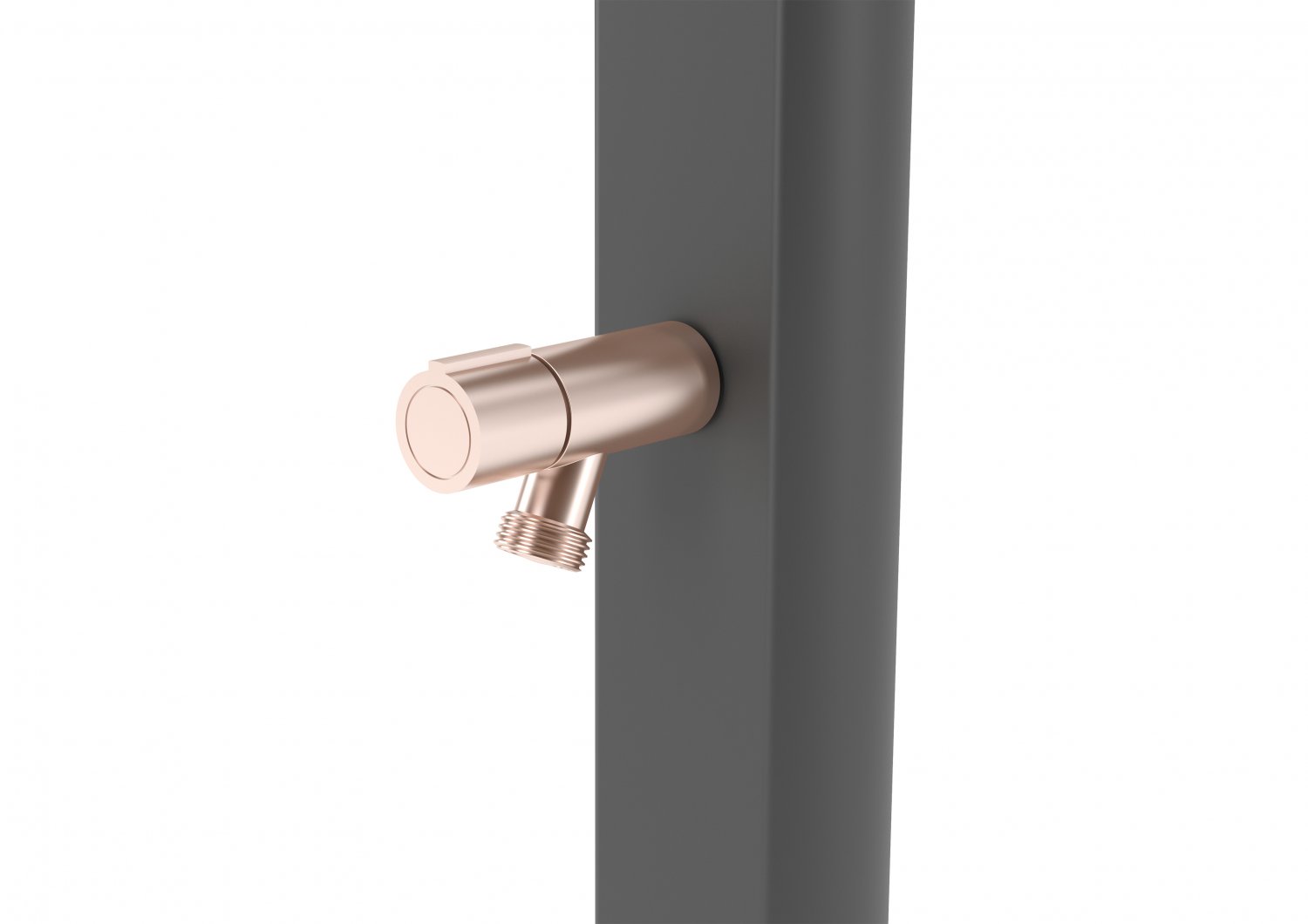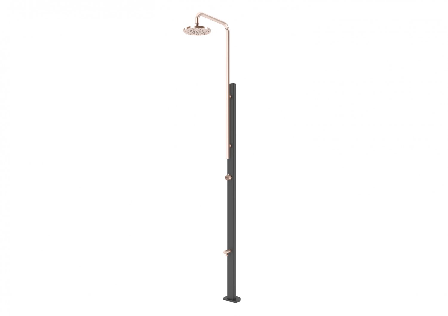 • AISI-304-L rozsdamentes acél cső és alumínium keret. • Fémes felületek és színek széles választéka. • Vízkőmentes zuhanyfej és esőhatás. • Hideg-meleg vizes keverőcsap. • Lábmosó csap. • Könnyű karbantarthatóság: vízelvezető a zuhany téli leürítéséhez a sérülések és a kopás elkerülése érdekében. • A hátsó bemenet tömlőcsatlakozással kompatibilis. 1/2" Méretek: Magasság: 2100mm, Test: ?150mm, Zuhanyfej: ?200mm