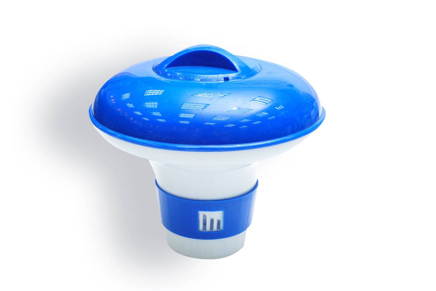 Úszó vegyszeradagoló 3”-os (200 grammos) tablettákhoz. Nem korrodáló polipropilénből, elcsavarható tetővel a tabletta behelyezéséhez. A lassan oldódó vegyszertablettákat belehelyezve biztosítható a víz folyamatos fertőtlenítése. Az adagoló alsó részén elforgatható karimával beállítható a tabletta optimális oldódási sebessége.